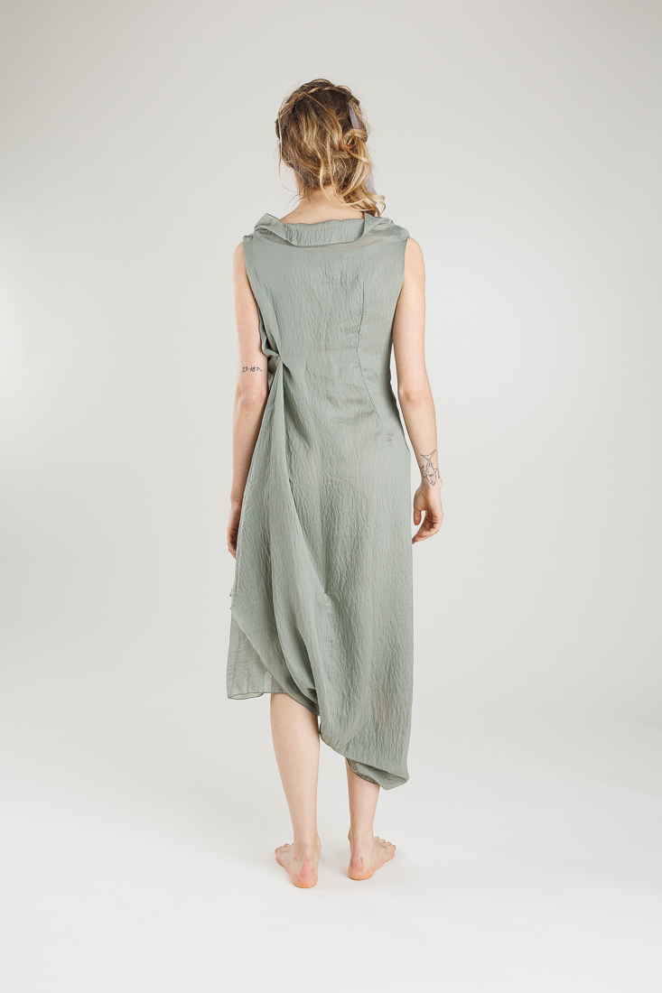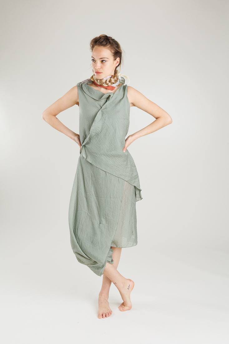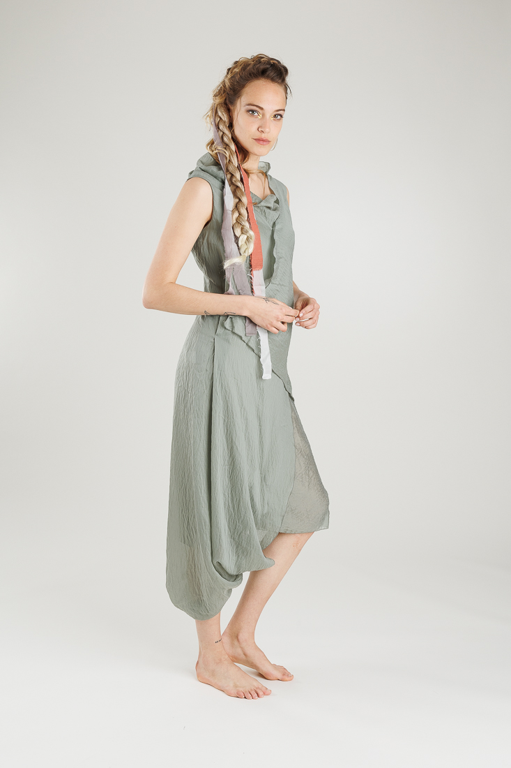 Saum mit Knopfleiste zum Verschließen, wobei ein Bein wie bei einer Hose und eines wie bei einem Kleid abgedeckt ist.