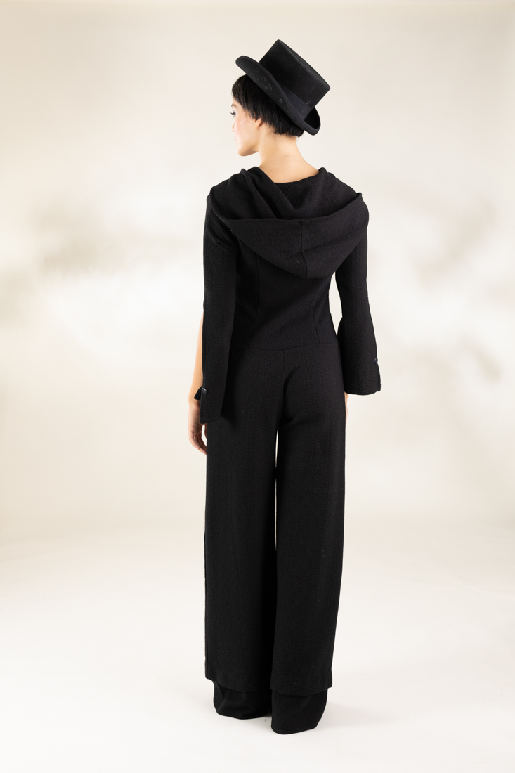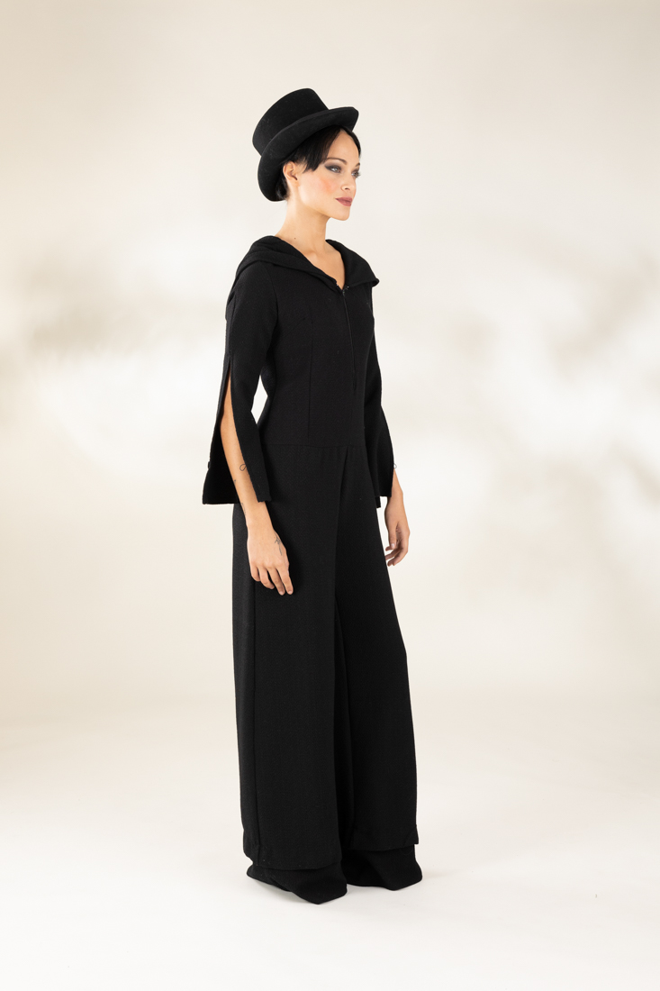 Zippered hooded jumpsuit that offers possibilities for playing with the sleeves, zipper and hood... excellent for any body type; indescribable, it needs to be tried on