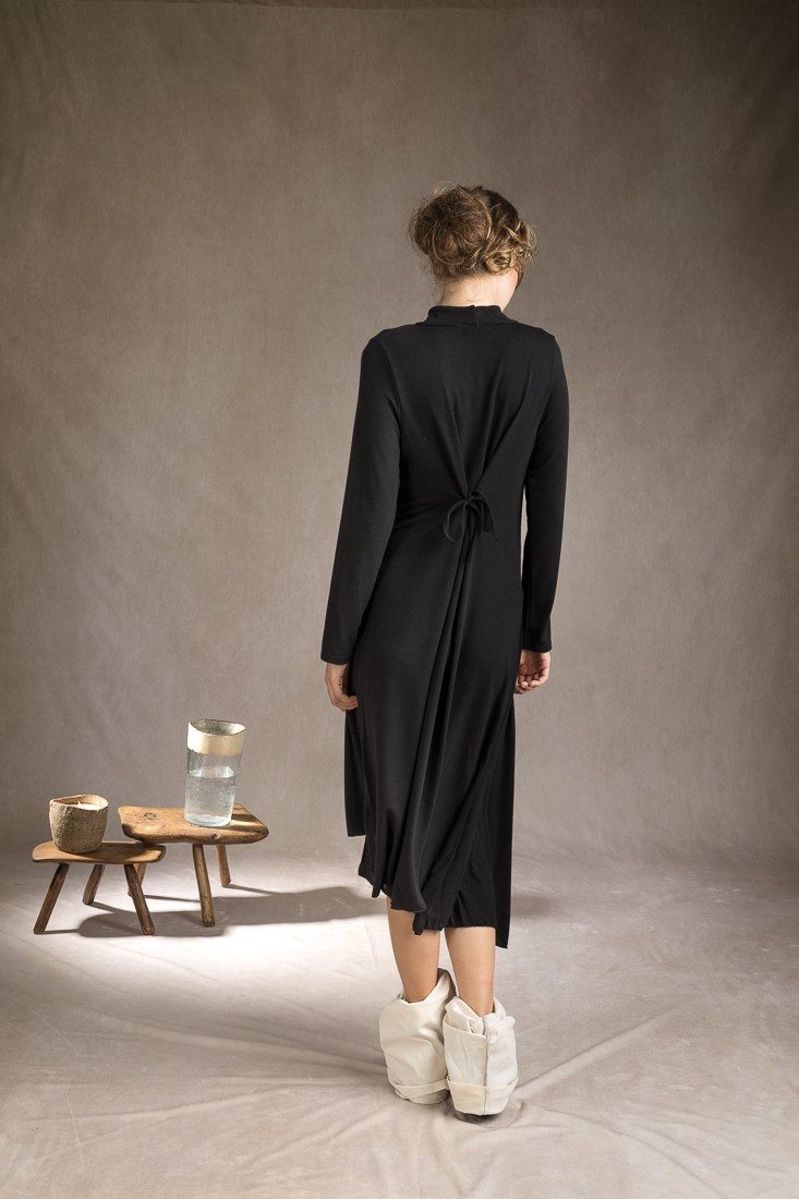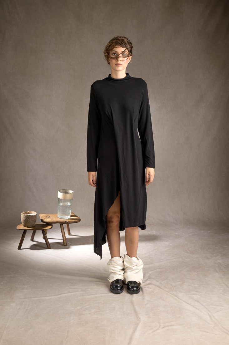 Vestido asimétrico por debajo de rodillaCuello altoGran pliegue en el centroBajo con vuelo y aberturas lateralesCordones en la espalda para ajustar talle Prenda confortable gracias a la elasticidad del tejido